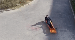 队长被绑在担架上扮伤员