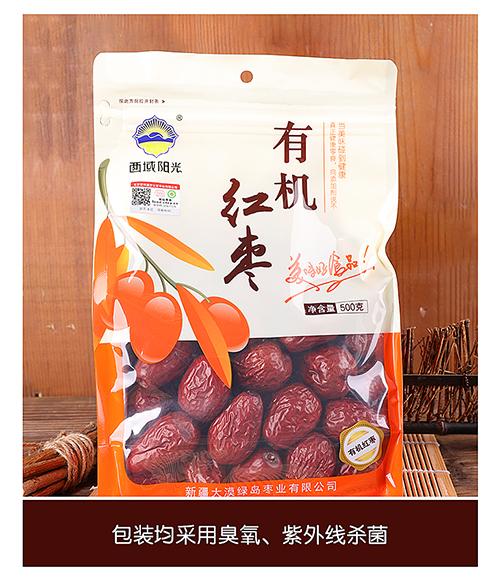 西域阳光有机红枣由新疆大漠绿岛枣业有限公司生产,公司拥有12000平米工厂,18个冷库,采用现代科技进行加工,从电光三色分选,再到手工二次甄选,保证每颗红枣大小均匀,无虫无害,清洗红枣并进行两次糖化,无菌包装,保证红枣的优良品质。