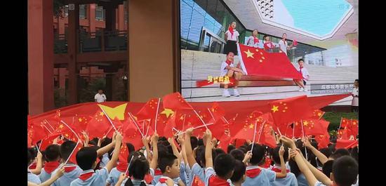 “今天是你的生日,我的中国。清晨我放飞一群白鸽,为你衔来一枚橄榄叶,鸽子在崇山峻岭间飞过……”清澈、干净的无器乐伴奏童声合唱响起,一面巨大的国旗环绕校园,9月开学第一课,这样激动人心的场景出现在四川大学附属实验小学的校园,2000余名师生挥舞着手中的红旗,深情呼唤:“我爱我的祖国!”