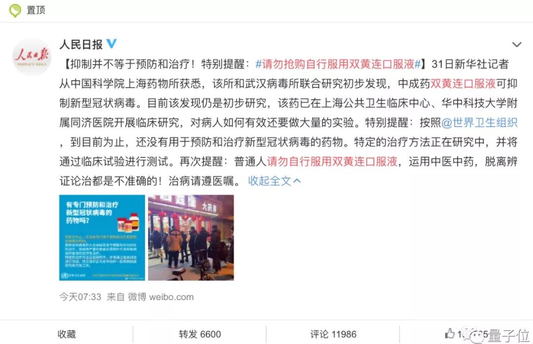 今天早上,人民日报也发布了新的微博,并给出特别提醒:请勿抢购自行服用双黄连口服液。