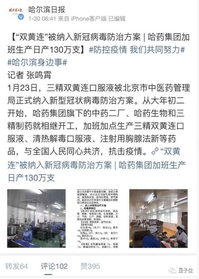 据哈尔滨日报1月30日报道,大年初二(1月26日),哈药集团旗下的中药二厂、哈药生物和三精制药就相继开工,加班加点生产双黄连口服液、清热解毒口服液、注射用胸腺法新等药品。