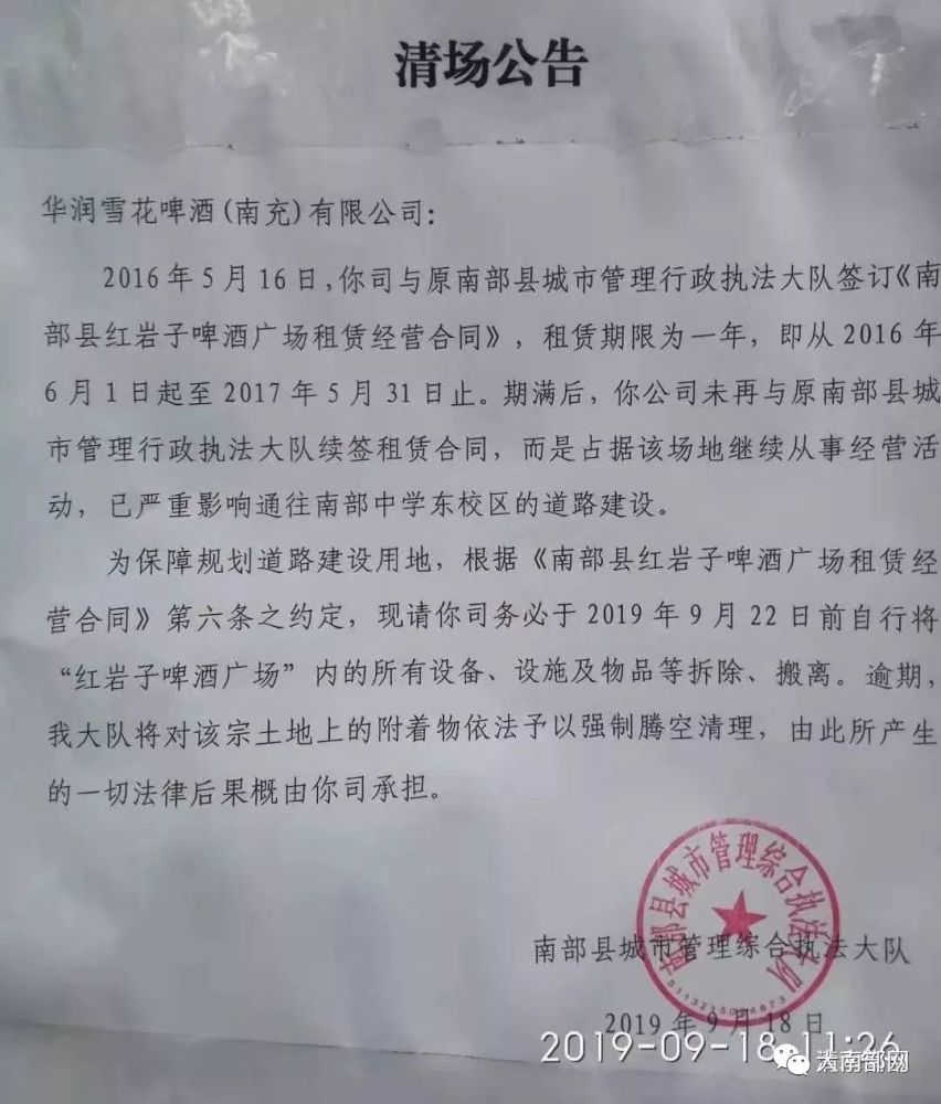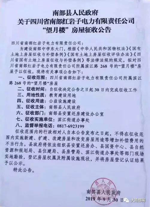 此前,9月份,从南部县人民政府获悉,南部县红岩子电力有限责任公司“望月楼”将被征收用于南部中学东大门建设。为了建设南部中学东大门,将依法征收的土地不止红电望月楼,旁边的红岩子啤酒广场,南部城管也已经发布清场公告。