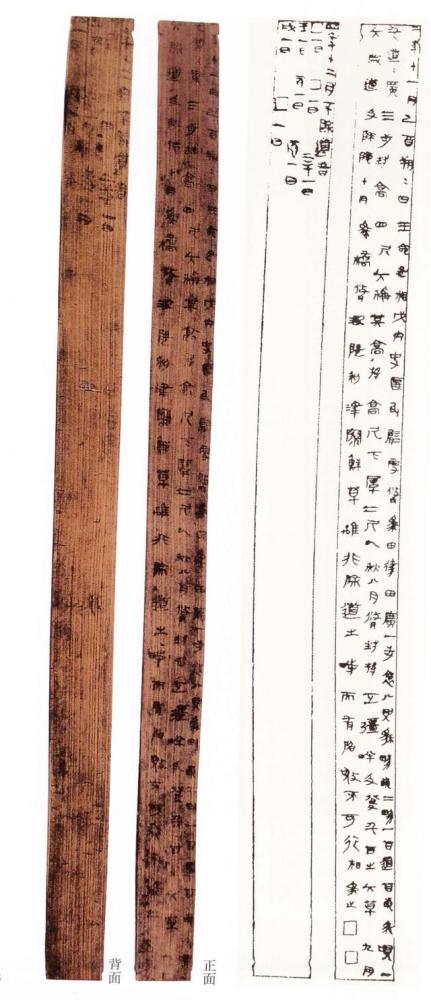 1980年,在四川省青川县郝家坪第50号战国秦墓中出土了两块木牍,其中一件长46cm、宽2.5cm、厚0.4cm,正面和背面皆书有墨书文字,正面残损较少,字迹清晰,文字直书3行,共121字。
