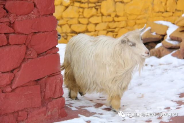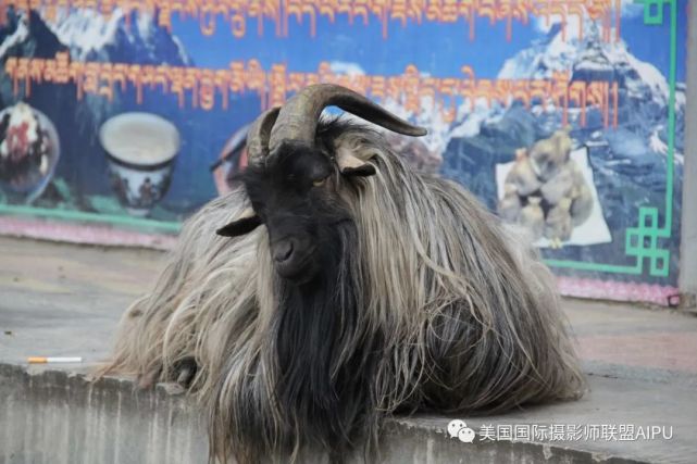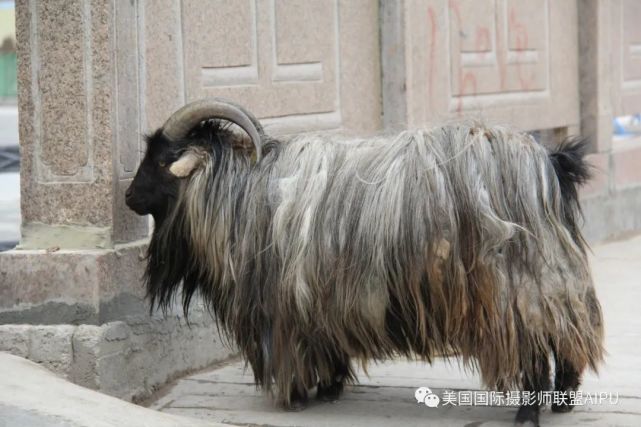 在拉卜楞寺转经道口的桥头上,一只气度不凡的神羊站在阳光下,一身白里透金的长毛齐地,头部、尾部四蹄黑色。一对月牙状的弯角,优雅的卷向脑后,一撮乌黑的长毛从颈部垂下,增添了几分潇洒。金色的眼球内黑色的眼珠神光灵动,这是我见过的最美的山羊。我忍不住轻轻的抚摸它,拿出包内的面包喂它。时而,他用身体靠靠我并用头触碰我,变化着姿态任我拍照,真有灵气。我半个上午不忍离去,准备的午饭让他吃了大半......