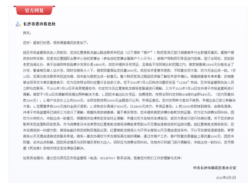 该回复称,经雨花区市场监管局执法人员核实,小李在红星美凯龙韶山路店联邦米尼店购买家具已签订销售单并付全款属实,根据商户提供的材料反映,小李在参加红星国际会展中心世纪家博会时被联邦米尼商家导购员引导至店内签单。