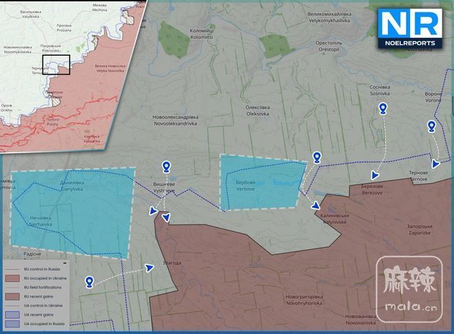 胡利亚伊波尔方向,由于严格的作战安全保密措施,确凿信息的获取仍较为困难。综合各方的消息,达尼利夫卡、涅恰伊夫卡以及其以西的区域很可能已处于乌克兰的控制之下,尽管目前还缺乏视觉确认的证据。同样的情况也适用于韦尔博韦及其以南的地区(二者均用亮蓝色标出)。