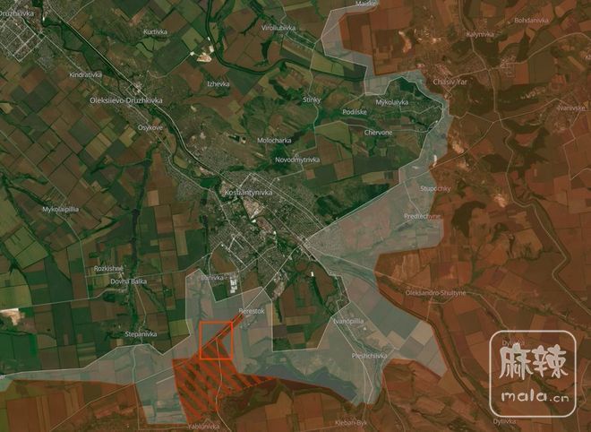 康斯坦丁尼夫卡方向,过去48小时,俄罗斯方面取得了不小的进展。俄军部队已在前方哨所(红框区域)附近精心构筑的战壕内站稳脚跟,处于可以俯瞰康斯坦丁尼夫卡的主要山丘之上。