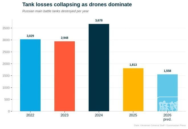 俄罗斯在4年战争中损失的坦克,比北约组织的全部坦克保有量还要多。无人机使装甲变得无异于自杀。如今,俄军的作战方式已转为徒步。新造的T-90M坦克不会开往前线。它们正被部署到芬兰方向——面对北约组织,而非乌克兰。