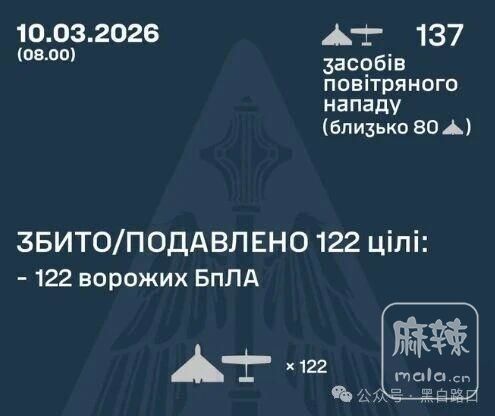 3月10日,俄罗斯发射137架无人机袭击乌克兰多地,乌军击落122架无人机,10个地点记录到撞击,另有10个地点被无人机残骸覆盖。