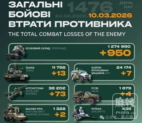 今天是俄乌战争第1476天(2026年3月10日),过去24小时大事件概述如下: