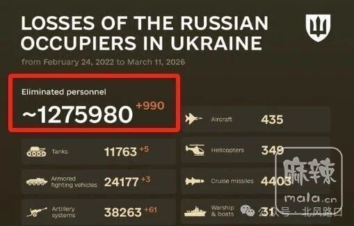 乌军总参谋部3月11日数据显示,俄军损失1275980人,这个数据对俄罗斯来说是致命的,该数据可能还偏低。