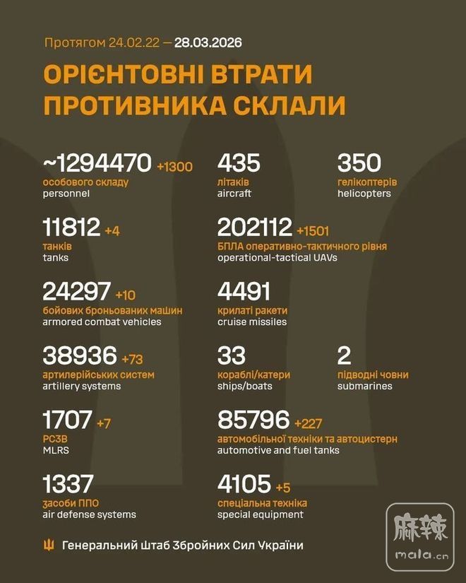 乌总参公布的昨日战果,歼敌(击毙+重伤)1300人。
