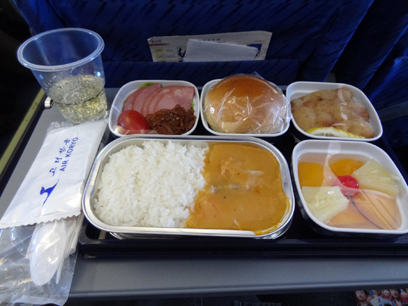 我们从北京飞往朝鲜搭乘的是高丽航空的图-204客机。机上午餐提供了咖喱鸡、炸鱼排、火腿、咸菜、面包,还有朝鲜自产的苹果味汽水。