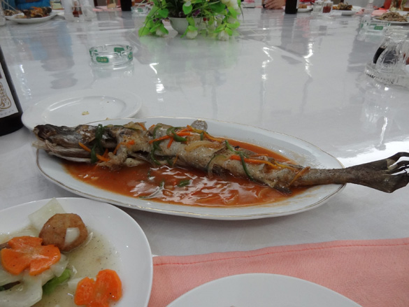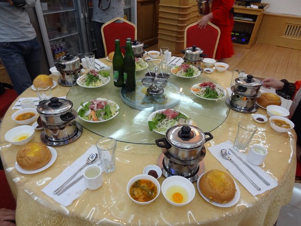 旅行团每顿饭都是在专门接待外国游客的餐厅吃的,图为一家火锅餐厅为游客准备的晚餐。