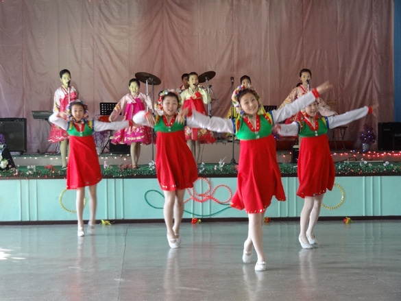 旅行团参观平壤一所示范小学时,学生们为游客表演歌舞。