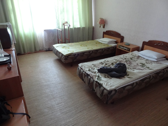 元山市的酒店客房内景,地上铺着凉席,还有一台无法使用的夏普电视。