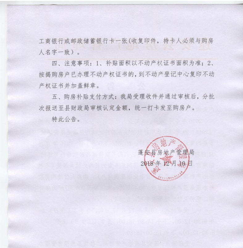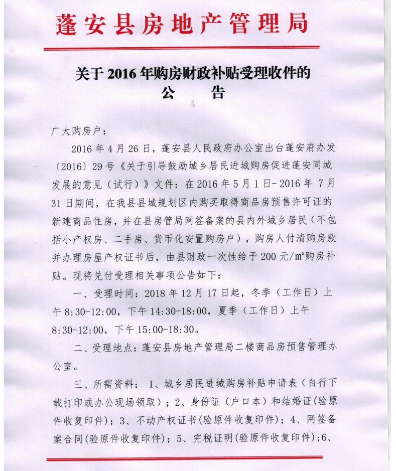 2016年4月26日,蓬安县人民政府办公室出台蓬安府办发〔2016〕29号《关于引导鼓励城乡居民进城购房促进蓬安同城发展的意见(试行)》文件:在2016年5月1日- 2016年 7月31日期间,在我县县城规划区内购买取得商品房预售许可证的新建商品住房,并在县房管局网签备案的县内外城乡居民(不包括小产权房、二手房、货币化安置购房户),购房人付清购房款并办理房屋产权证书后,由县财政一次性给予200元/㎡购房补贴。现将兑付受理相关事项公告如下: