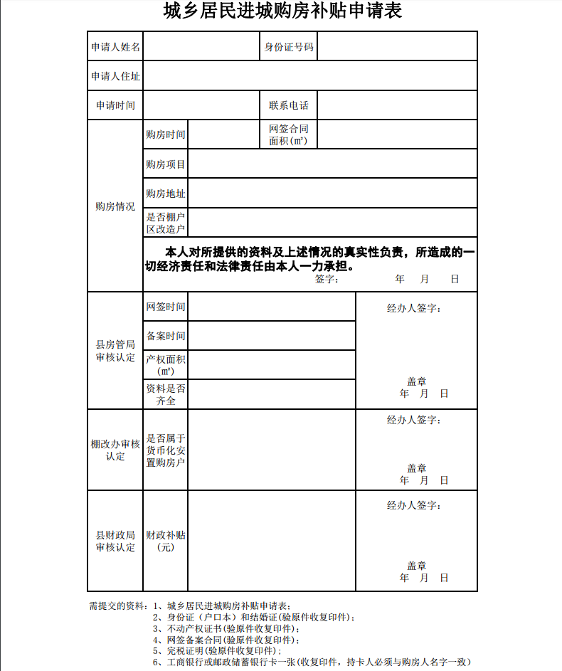 1、城乡居民进城购房补贴申请表(自行下载打印或办公现场领取);