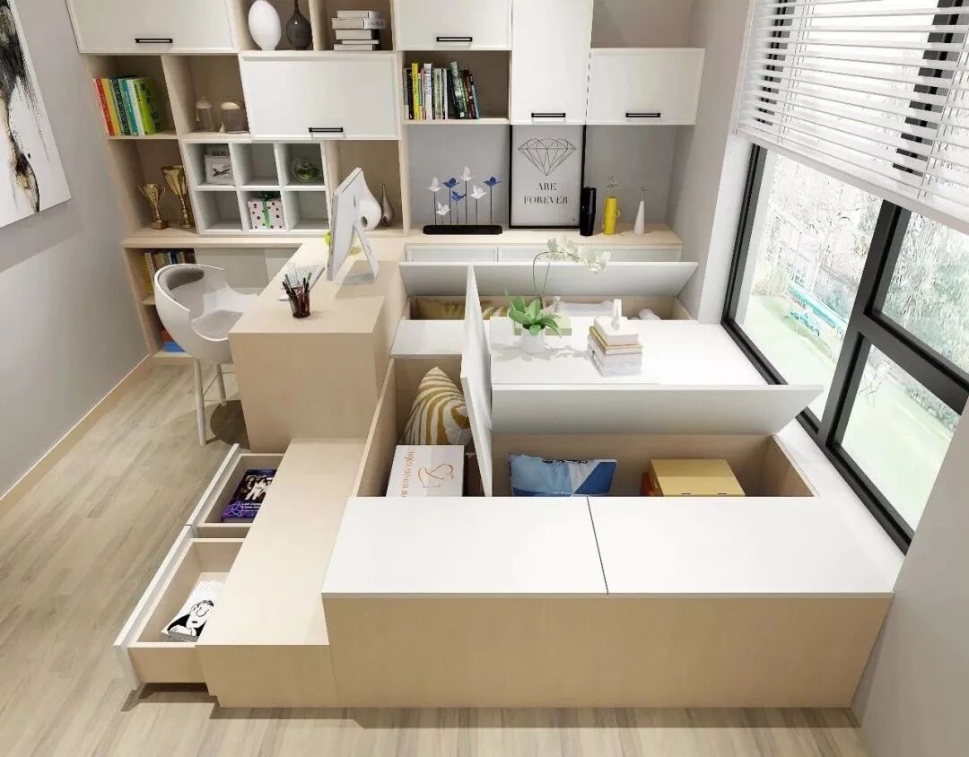 方法:榻榻米+书桌+收纳柜选择性组合设计