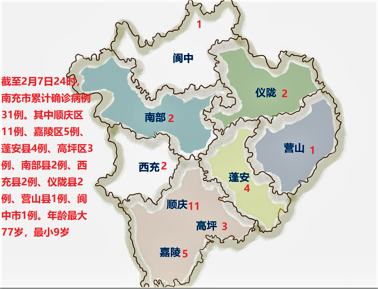 截至2月7日24时,我市新增1例新型冠状病毒肺炎确诊病例,累计确诊病例31例。涉及9个县(市、区),其中顺庆区11例、嘉陵区5例、蓬安县4例、高坪区3例、南部县2例、西充县2例、仪陇县2例、营山县1例、阆中市1例。年龄最大77岁,最小9岁。 31名患者中,重症1人,治愈出院2例,其余患者病情平稳。 正在接受医学观察1177人,当日已解除医学观察93人。 新增患者情况: 钟某:男,33岁,高坪区喻家乡十圣村人,常住贵州省遵义市仁怀市茅台镇。2020年1月21日从贵州自驾私家车返回南充。2月3日因发热到高坪区人民医院就诊,医院随即收治隔离。 目前追踪到位的密切接触者已按疫情防控要求规范处置。