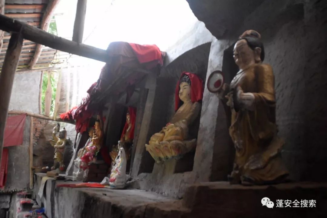 高高的山崖下,一块宛如巨鲸似的巨大黝黑的石头仿佛凭天而降,高高地矗立在距离山崖前十余米远的一块坡地里。巨石长约二三十米,高约十余米,山崖与黝黑的巨石之间有一条蜿蜒曲折的小路穿行而过,通往远处。黝黑的巨石仿佛遭遇过烈火焚烧一般,石上几乎寸草不生,石上有不知何朝何代的人雕琢而出的一些歪歪斜斜的小石窝,可供人们向上攀爬至巨石顶部。距离孤独矗立的巨石十余米远的高高的山崖上,雕刻有摩崖造像,山崖正中的摩崖造像最大,端坐石龛正中,两旁山崖上同时各雕塑有三四尊石像,估计雕刻的是佛祖、观世音菩萨等等神像,但神像的头部都被人为地打掉了,估计是毁于文革破四旧的浩劫之中了。