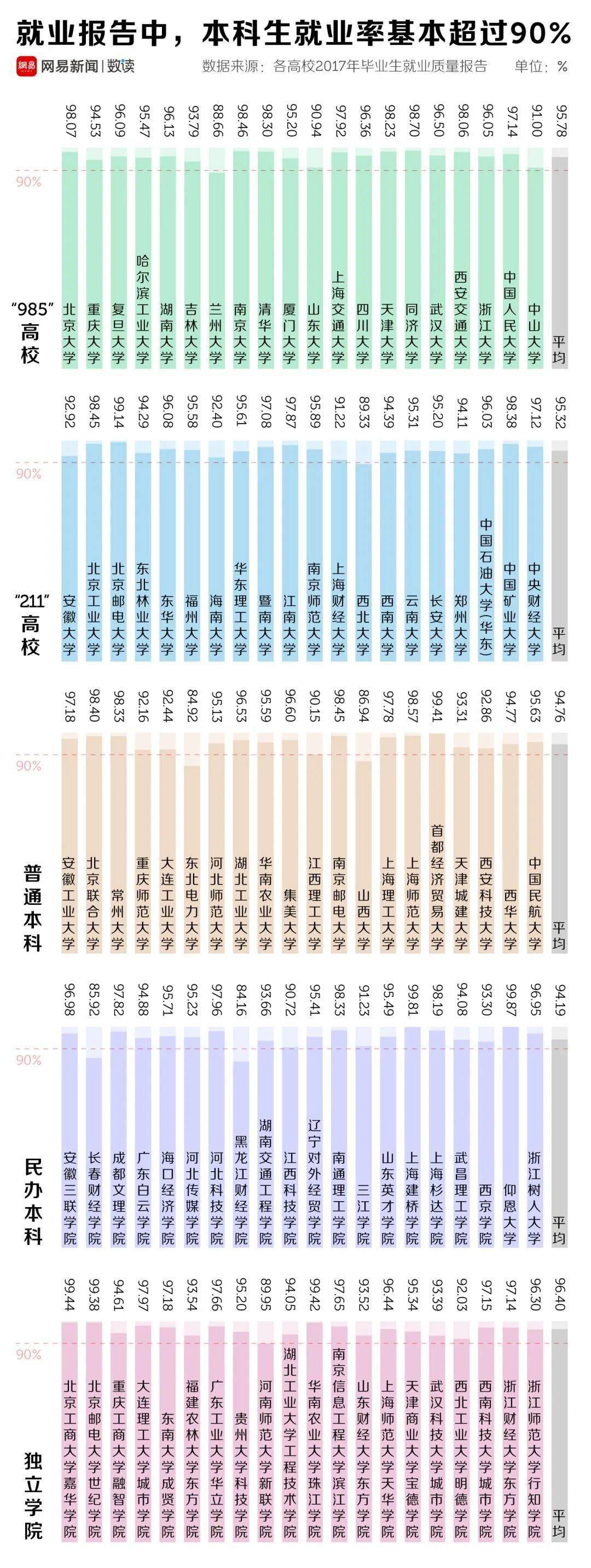 网易数读曾梳理了国内100所高校在2017年的本科生就业率,并将这些大学分为“985”高校、“211”高校、普通本科、民办本科和独立学院五种类别,结果显示,每一类高校的本科生就业率基本高于95%。