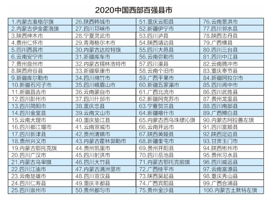 《报告》显示,2020中国西部百强县市分布在11个省(自治区、直辖市),分别为四川29个、内蒙古12个、云南12个、新疆11个、贵州10个、陕西9个、广西7个、重庆6个、宁夏2个、甘肃1个、青海1个。其中,西昌市为四川县域发展的“领头羊”,紧随其后分别为彭州市、简阳市、金堂县、都江堰市、新津县、广汉市、江油市、仁寿县、崇州市、邛崃市、绵竹市、峨眉山市、什邡市、射洪市、大竹县、宣汉县、泸县、大邑县、渠县、岳池县、邻水县、三台县、中江县、阆中市、武胜县、南部县、富顺县以及今年首次上榜的威远县。