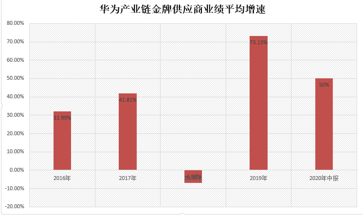 期间,大量华为金牌公司高速发展,以A股411家华为概念公司为例,金牌供应商们在2016年-2019年的业绩增速分别是31.99%、41.81%、-6.9%、73.13%。除了2018年下滑之外,其他时间都保持两位数增速。