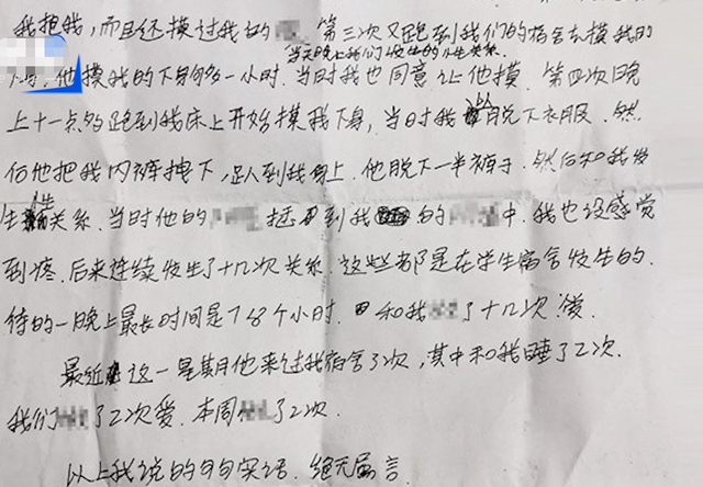 小娟说不会写,他就说,我说一句,你写一句!”“不要告诉你家里人,也不要告诉别人,你要是敢说我就让你坐禁闭,打死你!”