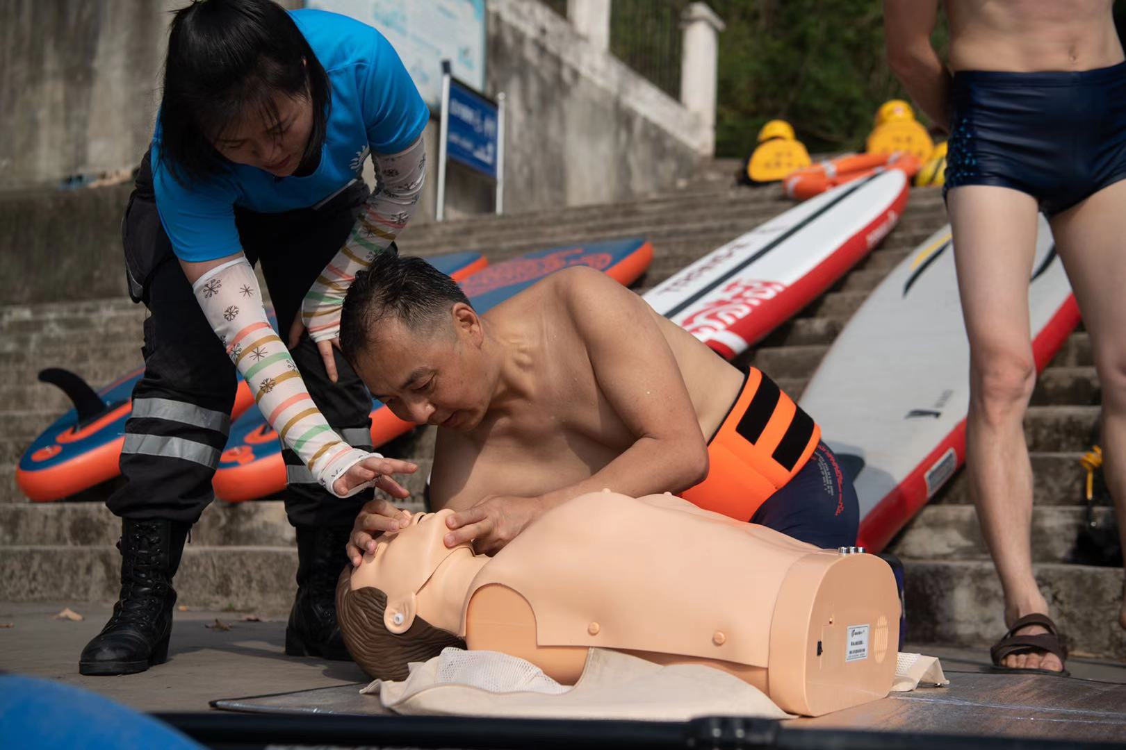 美女在询问了“有没有打120”急救电话后,马上开始疏散围观群众——运用自己“会急救”的技术,对老人进行起了“心肺复苏”。