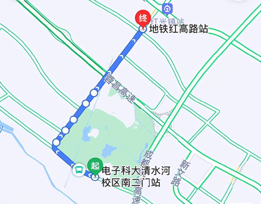 新开301路接驳电子科大清水河校区和地铁红高路站,看这线路覆盖电子科大清水河校区西、南门,不到20分钟就能坐上6号线,四舍五入电子科大通地铁了。