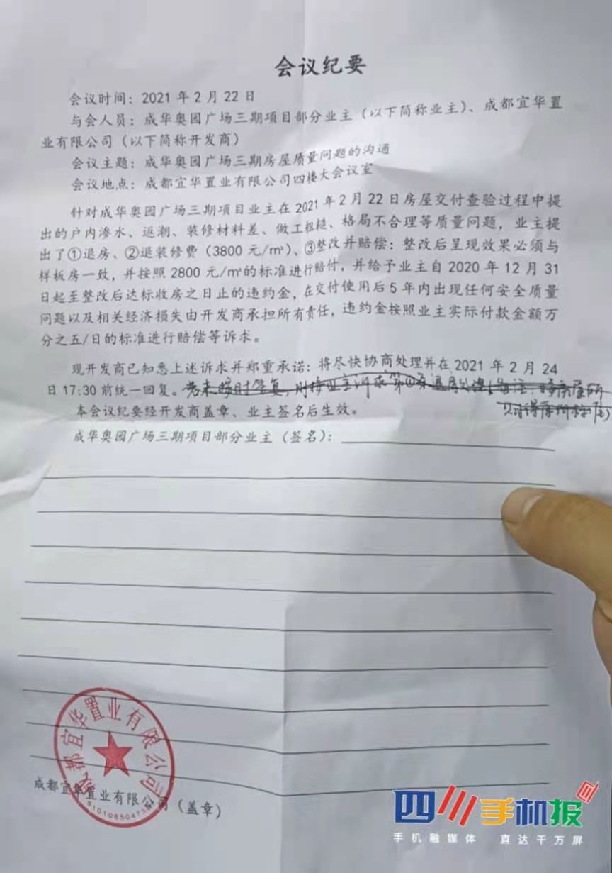 四川手机报记者从业主提供的一份盖有开发商成都宜华置业有限公司公章的会议纪要上看到,宜华置业曾于昨夜(22日)与业主召开会谈,业主提出了退房、退装修费、整改赔偿等诉求,开发商回应称将在2月24日17:30前统一回复。