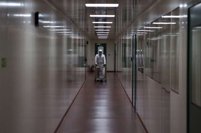 一名身穿防护装备的员工将手推车推入印度血清研究所的实验室内