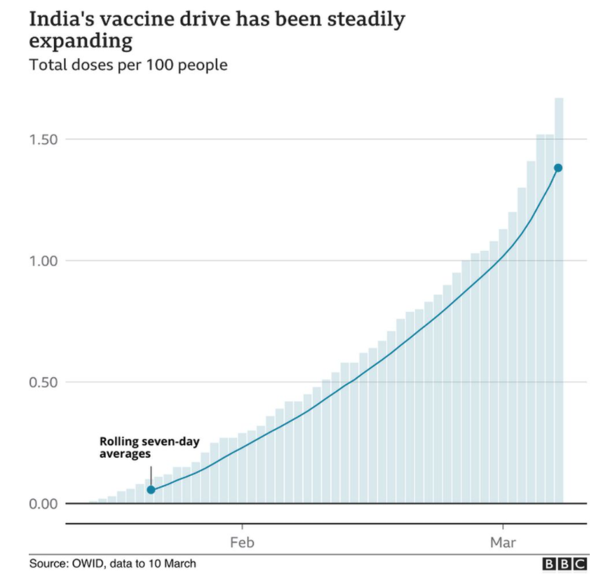 截至3月12日为止,仅有2000多万印度人注射了至少一剂疫苗,而政府的目标是在7月底前达到5亿的接种量,覆盖2.5亿“重点人群”,专业人士对这一速度表示担忧称,除非扩大接种力度,否则无法达到目标。
