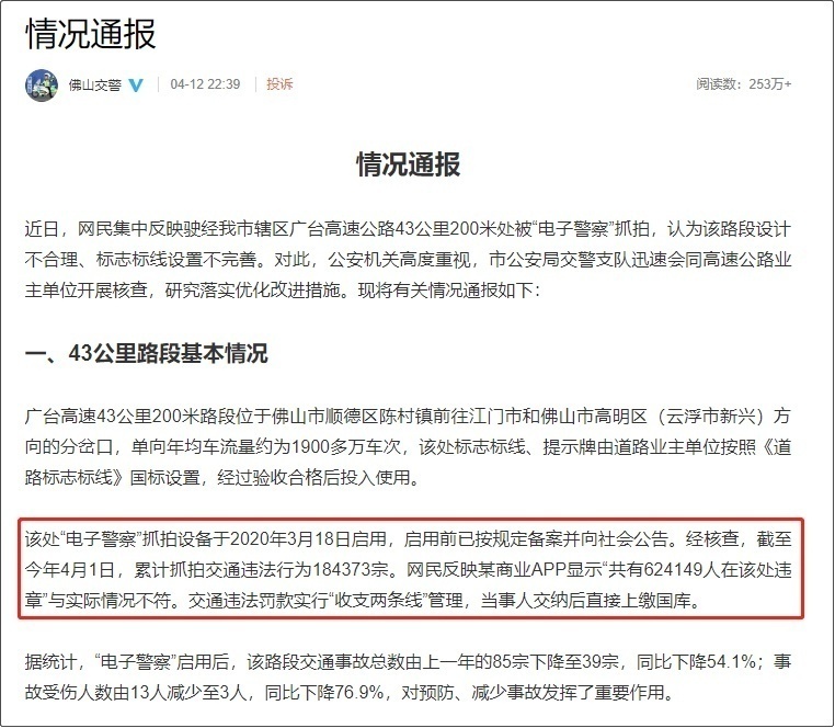 对于网友们的质疑和不满,佛山交警于4月12日在社交媒体上发布了《情况通报》(以下简称《通报》)进行回应。