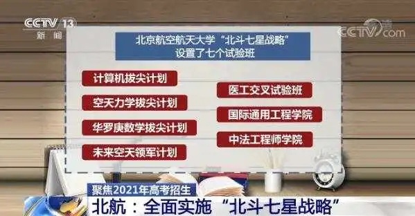 今年,北京航空航天大学针对拔尖创新人才将全面实施“北斗七星战略”,瞄准基础学科前沿和未来空天科技,设置了七个试验班进行招生,分别是计算机拔尖计划、空天力学拔尖计划、华罗庚数学拔尖计划、未来空天领军计划、医工交叉试验班、国际通用工程学院和中法工程师学院,计划招生350人左右。其中,前四个“计划”是北航今年新增的4个特色试验班,实现8年制本博贯通培养。