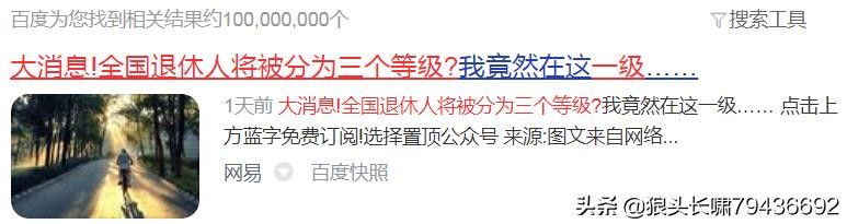 今(23)日清晨,社交网站搜索,大有所获:“百度为您找到‘大消息!全国退休人员被分为三个等级?’的相关结果约1亿个。”