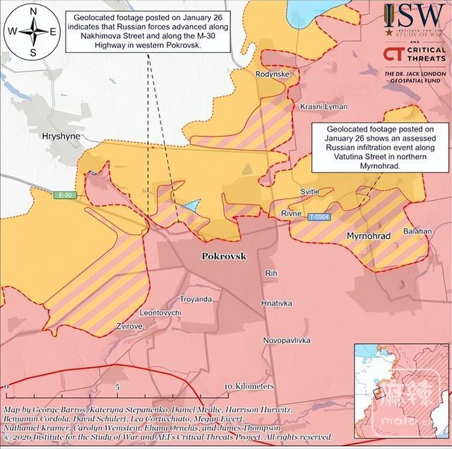 最新的地理定位视频显示,俄罗斯军队沿纳基莫娃街和M-30公路在波克罗夫斯克西部,以及米尔诺格勒北部瓦图蒂纳街的渗透。