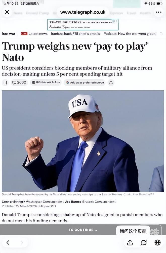 据《每日电讯报》消息,川普正筹划对北约实施重磅改革,拟推行“付费参与”(pay-to-play)制度,重塑北约内部权责分配体系。